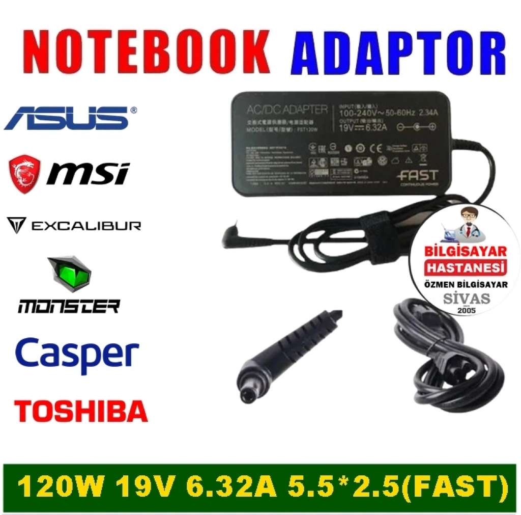 120W 19V 6.32A 5.5*2.5 Asus Monster MSI Excalıbur Toshiba Notebook Şarj Adaptör