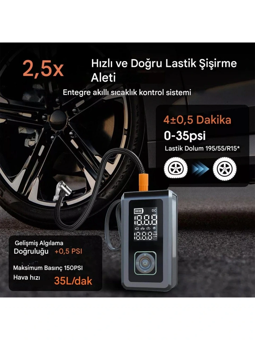 Taşınabilir Tasarım: Bu kompresör kompakt ve hafiftir, taşınması kolaydır ve fazla yer kaplamaz, bu da onu arabanızda her zaman bulundurmanız gereken pratik bir araç haline getirir.