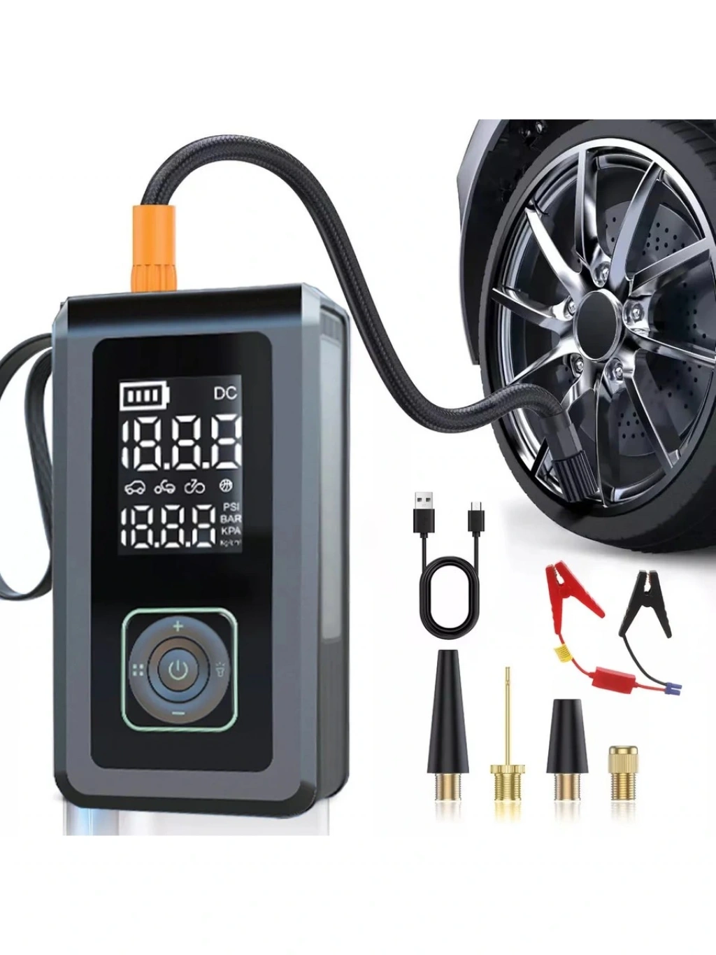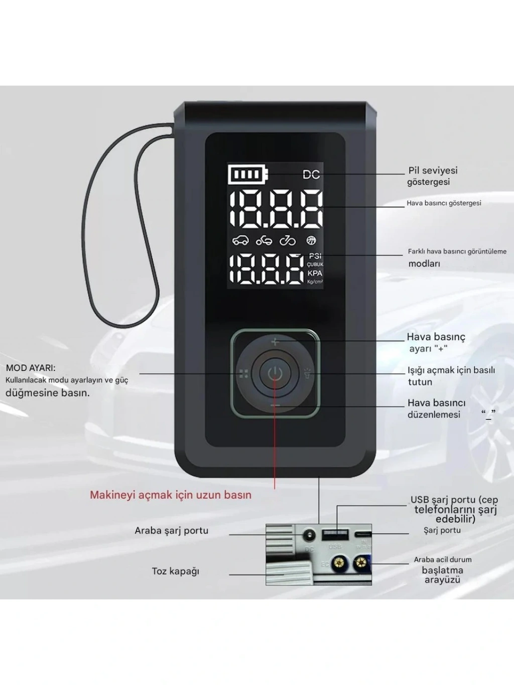 Bu çok işlevli bir araç şişirme pompasıdır: Çok işlevli araç hava pompamız, yolculuğunuz boyunca mükemmel bir yardımcı olarak her yönden koruma sağlar. Bu hava pompası, arabanızı, bisikletinizi, motosikletinizi ve çeşitli topları hızlı bir şekilde şişirmenin yanı sıra, akü bittiğinde aracınızı hızlı bir şekilde çalıştırabilen bir acil durum çalıştırma işlevine de sahiptir ve böylece her türlü durumla kolayca başa çıkabilmenizi sağlar.