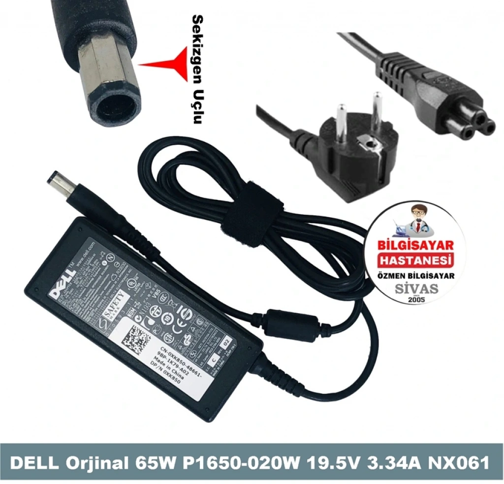 DELL Orijnal 65W P1650-020W  Sekizgen Uçlu  Şarj Cihazı 19.5V 3.34A NX061