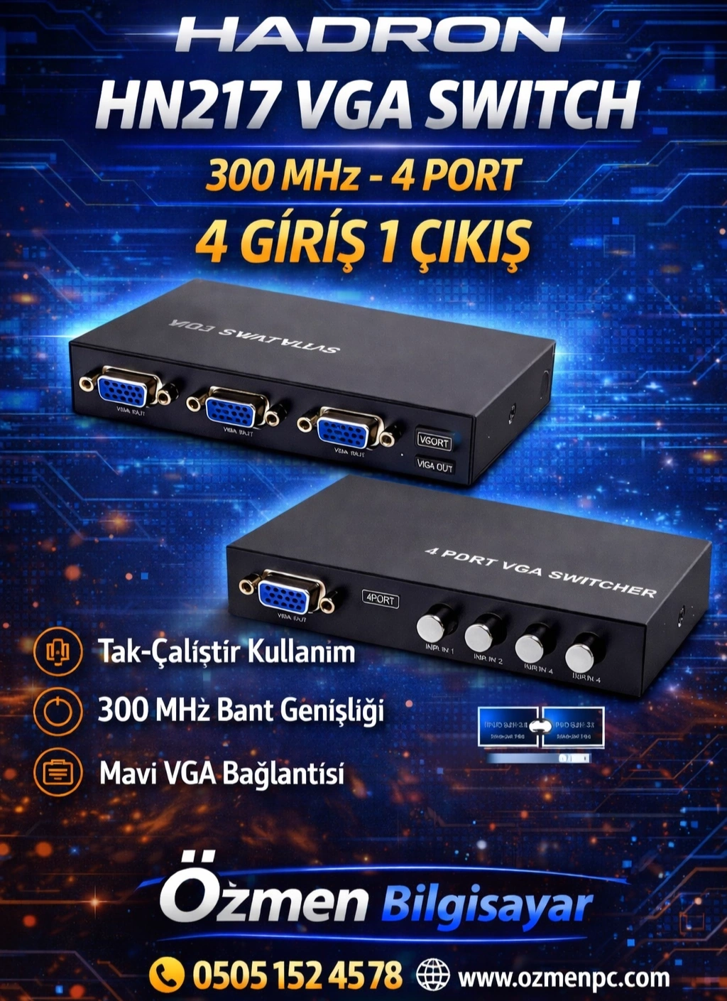 HADRON HN217 VGA SWITCH 300 MHZ 4 PORT 4 GİRİŞ 1 ÇIKIŞ DÜĞMELİ