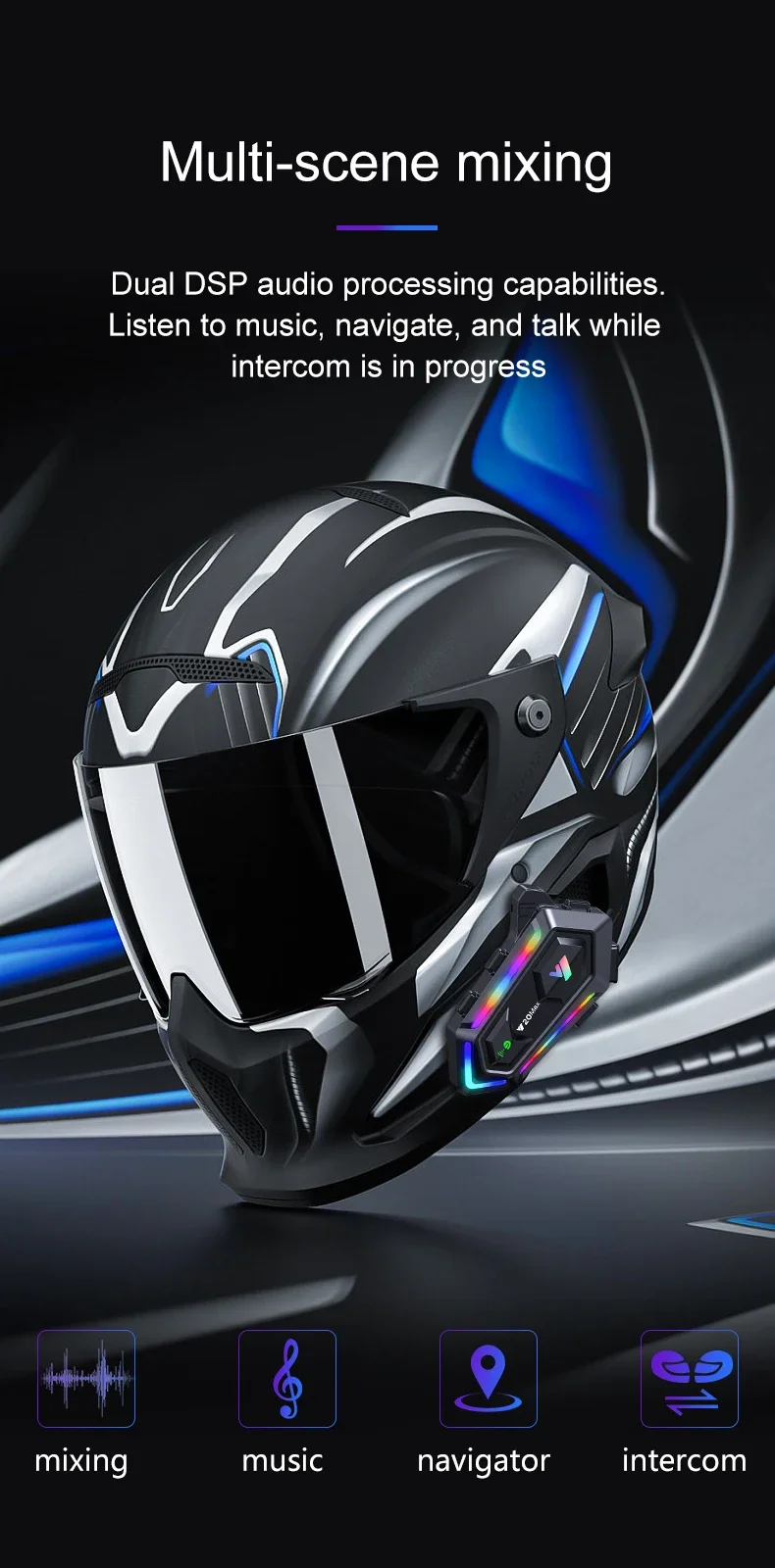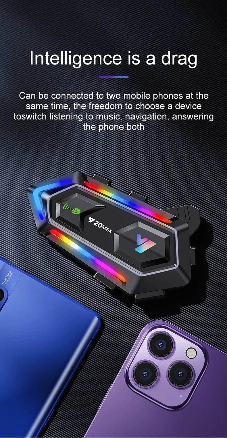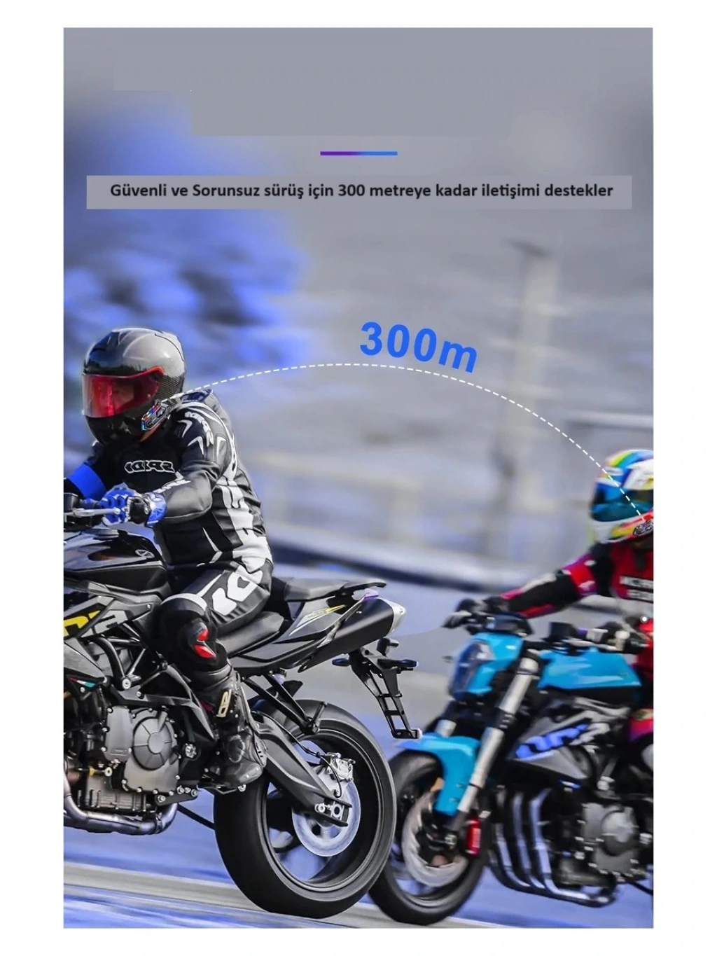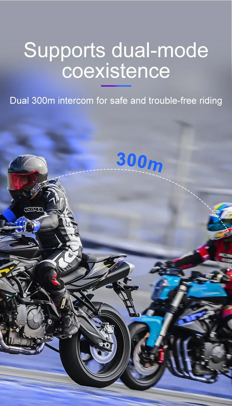 Destek 2 binici veya ön ve arka koltuk interkom, mesafe 300 metre. Birbirleriyle konuşurken müzik dinleyebilirsiniz.