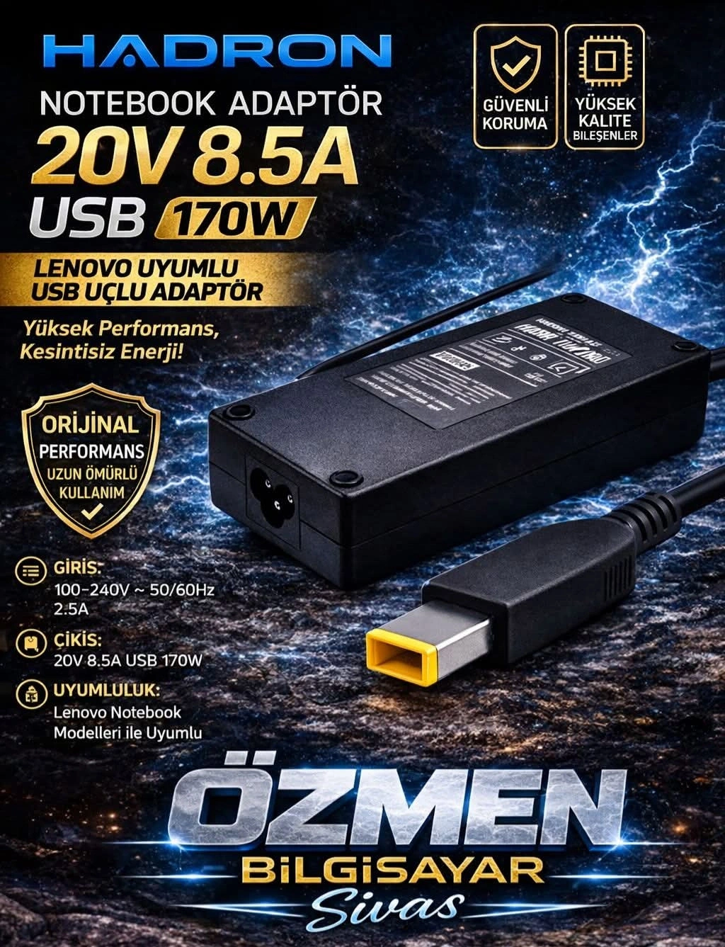 Hadron GXHH2, yüksek performanslı Lenovo dizüstü bilgisayarlar için tasarlanmış güçlü bir adaptördür. 20V çıkış voltajı ve 8.5A akım kapasitesi ile cihazınıza kesintisiz ve güvenli enerji sağlar. 170W güç kapasitesi sayesinde özellikle oyun ve profesyonel kullanım için idealdir. USB bağlantısı ile modern cihazlar ile uyumlu çalışır.